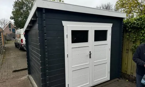Blokhut “Razende Bol” -250x300cm orenmaat -34mm vuren blokhuthout -Gecoat, 2x aan de buitenzijde: RAL7016 en RAL9010 -Enkele vuren deur half glas -Vuren uitzetraam 4-ruits -Enkel glas 4mm…