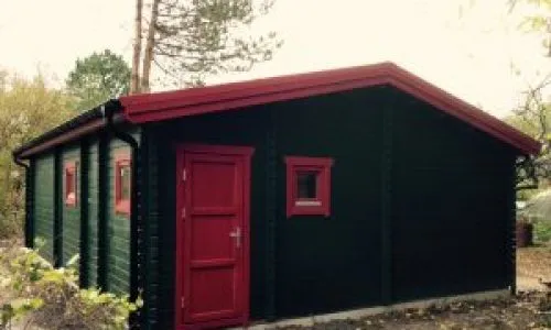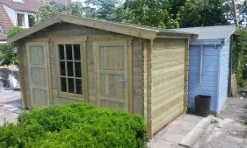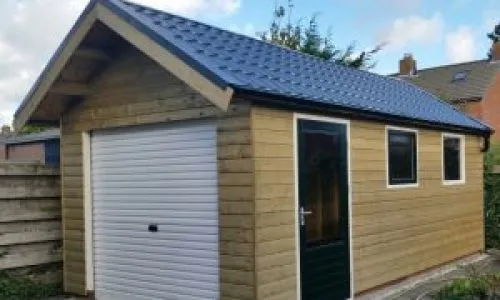 – Afmeting 425(orenmaat) x 200(binnenmaat)cm – Uitgevoerd in 34mm groen keteldruk geïmpregneerd blokhuthout – 2x vuren enkele dichte deur – 1x vuren XL uitzetraam – Enkel glas…