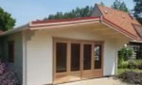 – Uitgevoerd in 70mm vuren blokhuthout – Afmeting totaal ca. 700x950cm orenmaat – Zijwandhoogte ca. 255cm, nokhoogte ca. 340cm – Trekstangen in het hout – Extra dikke ISO…