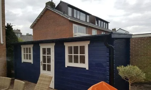 – Afmeting 600x200cm orenmaat– Uitgevoerd in 70mm blokhuthout– De wanden zijn gecoat in het Donker blauw, deuren en ramen in het Wit 9001– 1x vuren enkele deur…