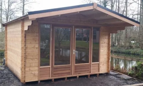 – Afmeting 380x380cm binnenmaat + voorluifel 150cm – Uitgevoerd in 45mm protex behandeld blokhuthout – Hardhouten Recron pui 201,5cm hoog (dubbele deur met lange vaste ramen) –…