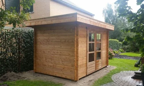 – Afmeting 335x225cm binnenmaat– Uitgevoerd in 28mm protex behandeld blokhuthout– Dakhoogte ca. 235cm– Hardhouten dubbele deur 3-vaks verdeling– 2x hardhouten steegraam 83x150cm– Enkel glas– Dakoverstek rondom ca.…