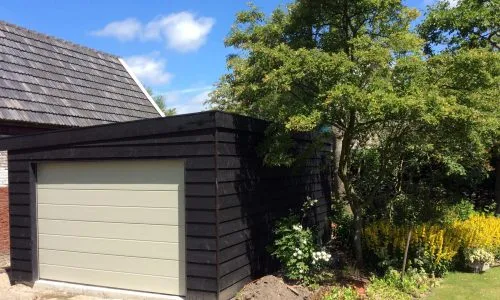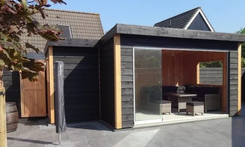 – Afmeting 400x600cm buitenmaat wand – Uitgevoerd in elementbouw, wanden bekleed met zwart Zweeds rabat – Zwarte planken als waterborden en daklijsten – Lessenaardak naar de zijkant…