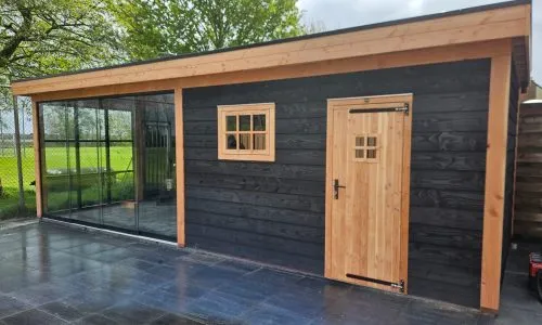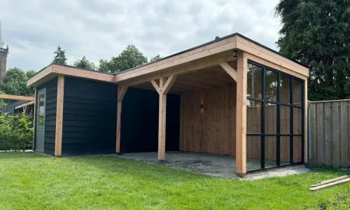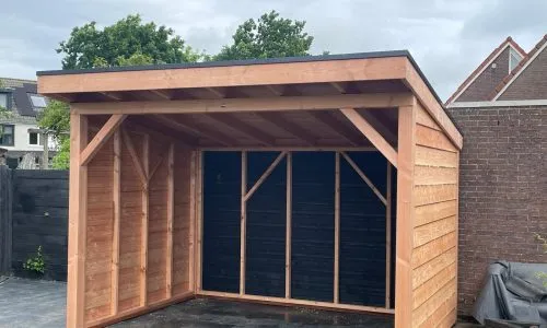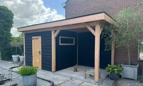 Douglas berging met overkapping -550x250cm, waarvan berging 300x250cm -Elementbouw, wanden bekleed met zwart gespoten Zweeds rabat, zwart genageld -6 Douglas staanders 140x140mm -Enkele Douglas dichte deur met…