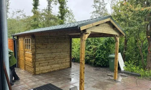 Blokhut + veranda ‘’Complete Maatwerk’’ – Uitgevoerd in 34mm groen geïmpregneerd vuren blokhuthout – Afmeting ±598x275cm orenmaat, waarvan berging ±249cm hart wand – 1x enkele vuren dichte…