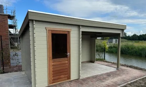 Blokhut Aktie Model -34mm vuren blokhuthout -500x275cm, waarvan berging 200x275cm -Wanden gecoat, RAL7032, accenten RAL7002 -Hardhouten enkele deur, half glas incl. enkel glas 4mm -Lessenaarsdak met een…