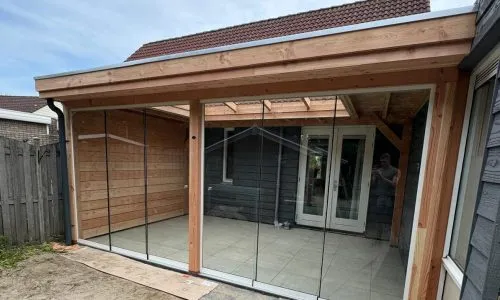 Douglas terrasoverkapping “Calciet” -543x340cm dakmaat -Linkerzijwand bekleed met Douglas grijs gespoten Zweeds rabat 27mm -Binnenzijde linkerwand bekleed met Douglas blank Zweeds rabat 27mm -5 Douglas staanders 140x140mm…