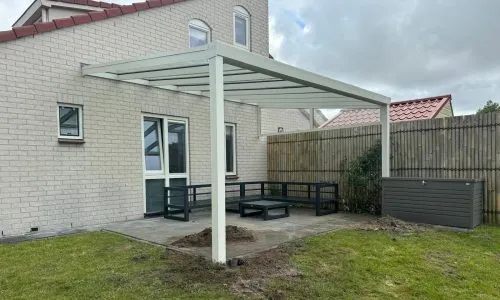 “Profiline” aanbouw terrasoverkapping -465x350cm -Incl. gelaagd glas -Op 2 staanders -Kleur: RAL9010 structuurlak -Vlakke gootwafwerking -Rubberafdekkers -Versteviging XS-goot incl. verlengde staanders en beton fundatie -Spie kozijn met…