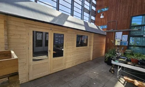 “ Blokhut Leslokaal “ -800x400cm (orenmaat) -60mm onbehandeld vuren blokhuthout -Kleedkamer ±250x300cm (orenmaat) -Schuurtje ±150x300cm (orenmaat) -Leslokaal ±500x400cm (orenmaat) -4 dichte gelamineerde enkele dichte deuren -1 vuren…