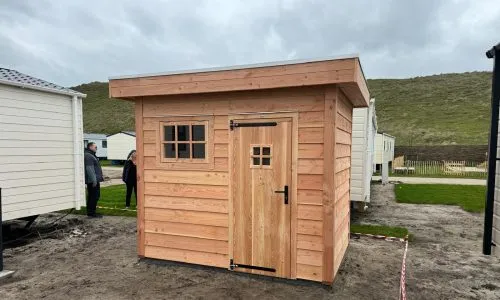 “ Douglas berging maatwerk“ -274,5x200cm ( buitenkant staanders ) -Elementbouw – Wij zetten de wanden af fabriek compleet voor u in elkaar, inclusief bestelde deuren en ramen.…