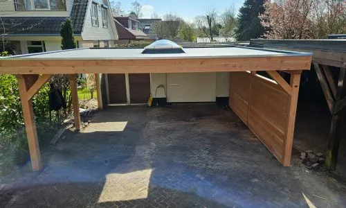 Douglas aanbouw carport -±575x540cm staandermaat -6 Douglas staanders geschaafd 140x140mm, 8 schoren 130x130mm -Rechterzijwand gesloten tot een hoogte van ±180cm, wanden enkelzijdig bekleed (buitenzijde) met Douglas Zweeds…