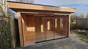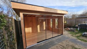 -Elementbouw, achterwand en linkerzijwand enkelzijdig aan de buitenzijde bekleed met